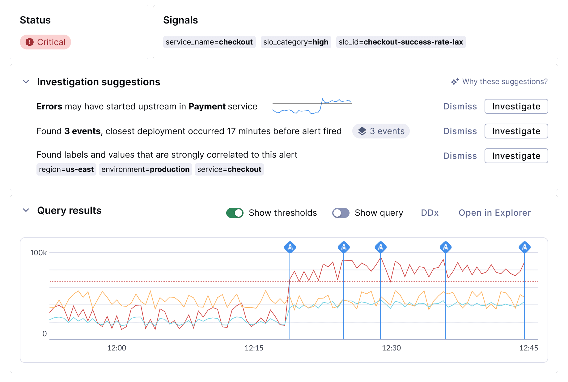 Chronosphere's AI-Powered Guided Troubleshooting uses advanced analytics and deeper system context to surface the most probable root causes—step by step. Get to resolution faster while building knowledge that makes every investigation smarter.