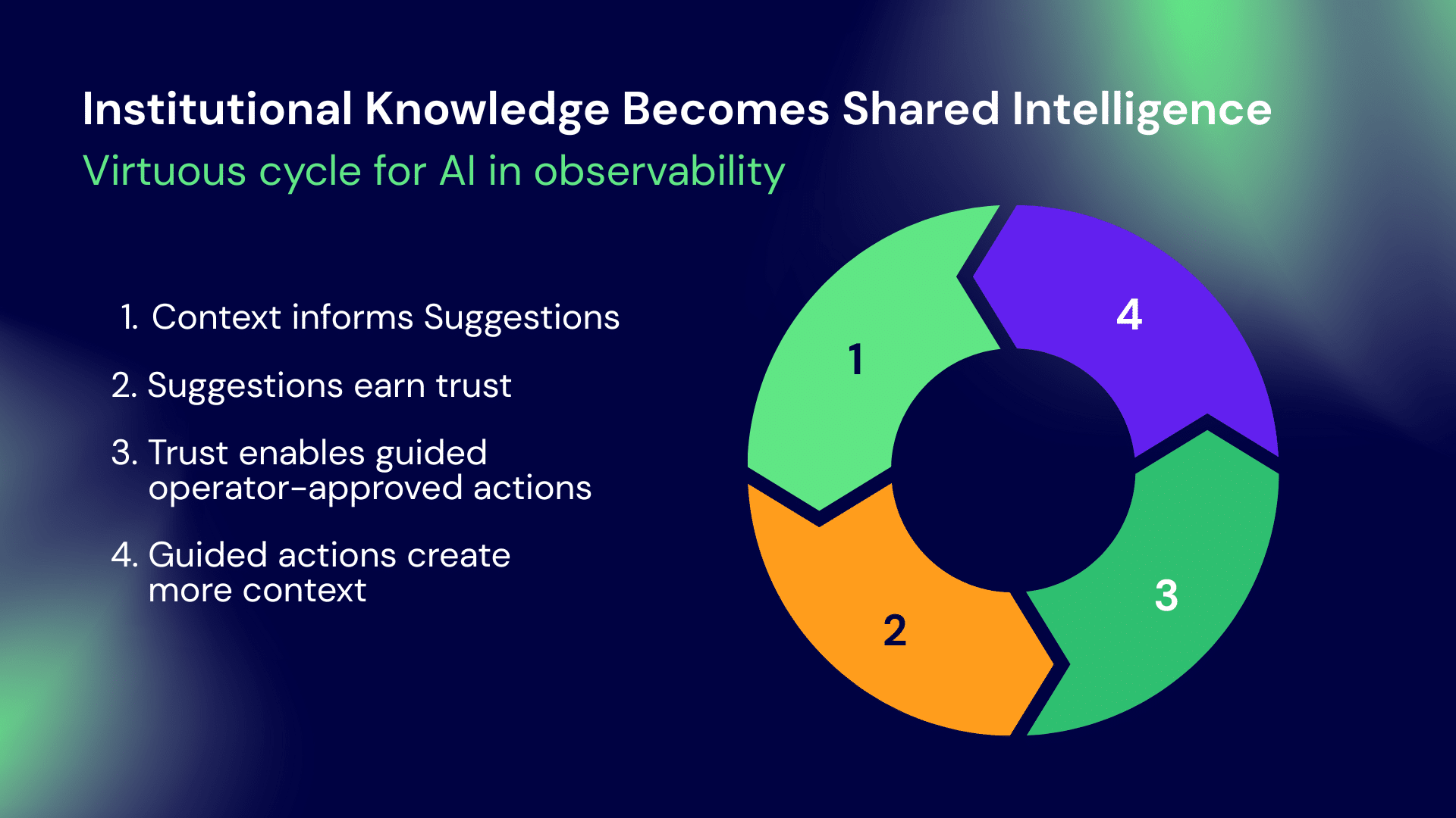 - Current transition: Guided workflows—AI identifies potential issues and suggests hypotheses and next steps in the investigation, while engineers validate and manually remediate the issue.