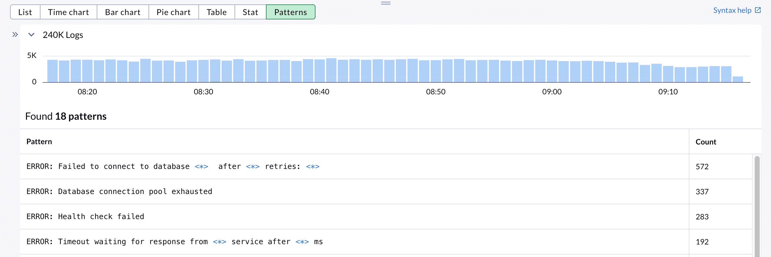 The Patterns feature groups repetitive log lines by their shared structure. So, you can see the shapes of your data first, then focus on the entries that are showing unusual behavior. It surfaces meaningful data without guesswork.
