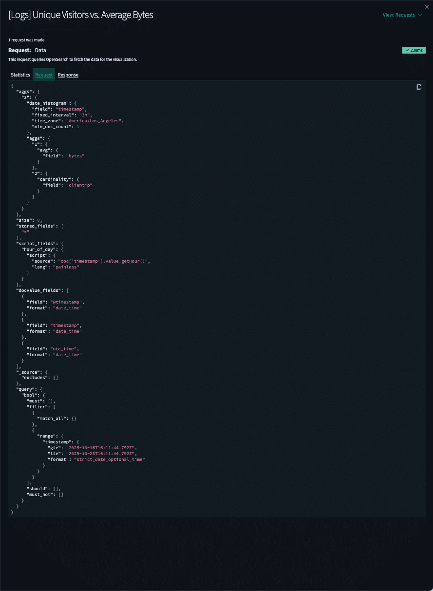 You would go to inspect, you would get data, but then you’d have to go to Requests. Requests are looking a little bit better, it looks like we have an index pattern that can be a source, that can be a start of a query. But then when you click into Requests, alright we’re getting some JSON. We have some information, but if you take a deeper look at it, there’s a lot going on in here.