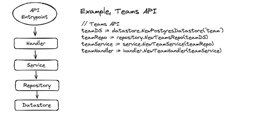 We’re setting up a service layer and a repository layer. The repository layer will use a Datastore interface, which can work with various database technologies. As long as these databases use the same functions, we won’t need to change the code in the repository or service layers at all.