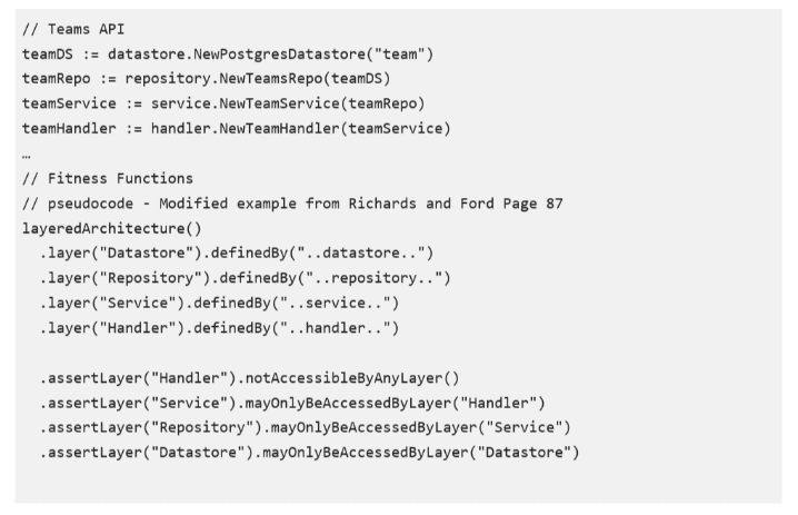 Then, to ensure we always meet this pattern and keep these layers decoupled, we would write a fitness function that verifies the service layer only ever imports the repository layer, and the repository layer only ever imports an implemented Datastore.