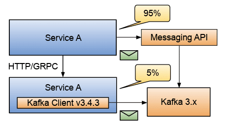 But more importantly, the edge cases, where we need to use some Kafka-specific features, for example, are extracted into a separate service that Service A can still interact with using HTTP or GRPC. Notice that the messaging API also uses Kafka to move information around. Still, for Service A, that is no longer relevant, because a simplified API is exposed as a platform capability.