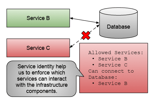 Before jumping into the next topic, I wanted to briefly talk about why having service identity at this level can also help reduce security problems when interacting with application infrastructure components. The figure above shows how similar service identity rules can be applied to validate who can interact with infrastructure components. Once again, the system will limit the blast radius if a service is compromised.
