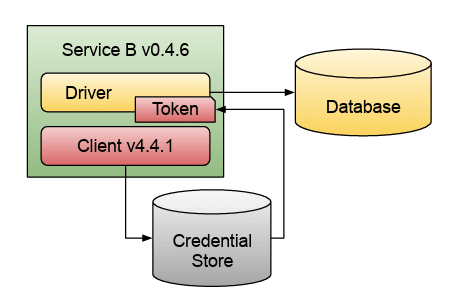 Service B connecting to a credential store, using a specific client library, to get a token to connect to a database.