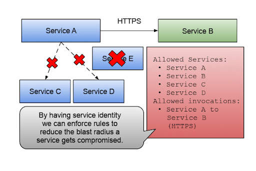 By enforcing rules based on service identity, the system can reduce the “blast radius” if a service is compromised—only allowed interactions are possible, instead of a “free-for-all” between all services. These identity checks are difficult to build inside each service and are better handled by external mechanisms at the platform level.