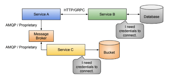 The figure below shows several example service interactions with each other and available infrastructure. Service A is calling Service B using HTTP (for this topic, GRPC would fit similarly). Service B stores and reads data from a database and will need the right credentials to connect. Service A also connects to a message broker and places messages into it. Service C can pick messages from the message broker and, using some credentials, connect to a Bucket to store some calculations based on the messages it receives.