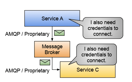 The figure below shows Service A placing a message into the message broker, which also needs credentials to connect. I also need credentials to connect the Service A Message Broker to Service C AMQP / Proprietary. The figure below shows Asynchronous messaging interactions at a later point in time. Service C can connect to the message broker and fetch messages from it.