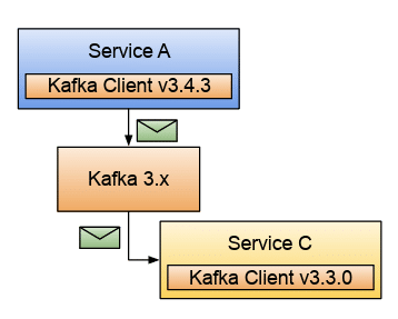 The figure above shows Service A, which includes the Kafka client library to connect to Kafka and send messages. Besides the URL, port, and credentials to connect to the Kafka instance, the Kafka client also receives configurations on how the client will behave when connecting to the broker, similar to databases. Service C uses the same client, but with different versions, to connect to the same broker.
