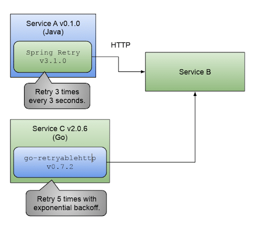 The figure above shows Service A written in Java using the Spring Retry library to retry three times with a wait time of 3 seconds between each request when the request fails to be acknowledged by Service B. Service C, written in Go using the go-retryable http library, is configured to retry five times but using an exponential backoff (the retry period between requests is not fixed; this can provide time for the other service to recover and not be flooded with retries) mechanism when things go wrong.
