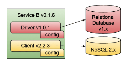 Let’s start by looking at dependencies. What kind of dependencies does Service B need to connect to a database? The diagram below shows Service B connecting to both a relational database and a NoSQL database. To achieve these connections, Service B needs to include a driver and a client library, plus the configuration needed to fine-tune how the application will connect to these two databases.